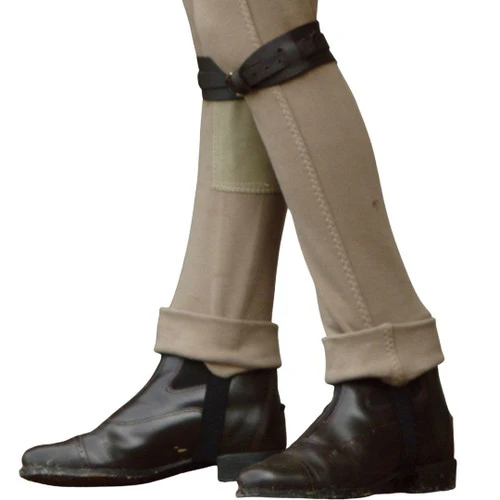 Jodhpur Garter Straps are a children’s riding apparel accessory for horse showing. Young children wearing jodhpur style riding pants with the cuff at the bottom use these leather straps just below their knee. It’s a traditional horse show accessory for kids, generally worn by the younger crossrails and short stirrup competitors.