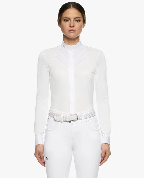Cavalleria Toscana Fan Bib Swiss Dot Show Shirt is truly a Cavalleria Toscana original, with feminine and flattering design. The Fan Bib Swiss Dot Show Shirt features long sleeves with button cuffs, a covered full length placket, and crisp show collar. The technical stretch jersey with Swiss dot texture is wicking, anti-odor, and fast drying for top equestrian performance.