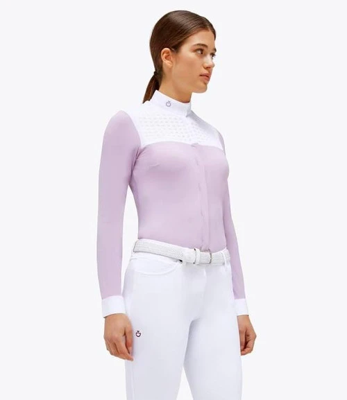 Ladies Cavalleria Toscana Jacquard Bib Long Sleeve Show Shirt is gorgeous as well as supremely functional for equestrian sport. The incredibly comfortable technical jersey fabric plus CT fine touches and details represent the best of this beloved Italian brand. The Jacquard Bib competition shirt is available in All-White or a lovely Light Mauve color with white bib, show collar, and cuffs.
