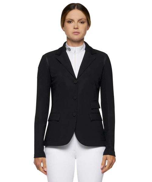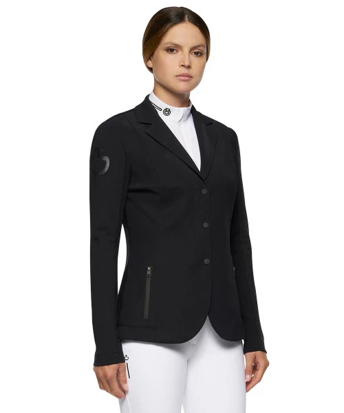 Women’s R-EVO Jersey Tech Knit Show Jacket from Cavalleria Toscana offers a classic cut, feminine lines, and highly breathable technical fabrics. The four-way stretch jersey plus technical knit jacquard inserts on the back and on the sleeves ensures total comfort and range of motion for equestrian competition.