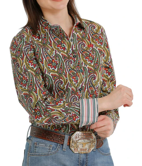 This Cinch Ladies Floral Paisley Performance Shirt has a plain front with no pockets for a clean, crisp profile. The performance cut Western shirt has a longer tail and sleeves for fuss-free riding. The beautiful vivid print on 100% cotton is perfect for spring and summer horse showing.