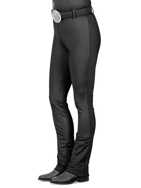 Hobby Horse Smarty Pants Show Pants for women are a Western show pant that is perfectly comfortable under chaps! These Smarty Pants show pants from Hobby Horse are super-heavy stretch pull-on pants to cover every curve and fit like a second skin under show chaps. Clever adjustable waistband accommodates different body shapes; black ten ounce fabric was created for football uniform pants, so it’s linebacker tough but machine washes, too.