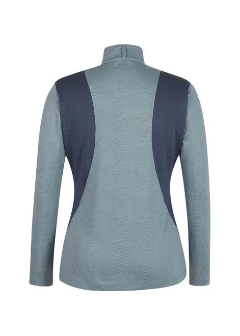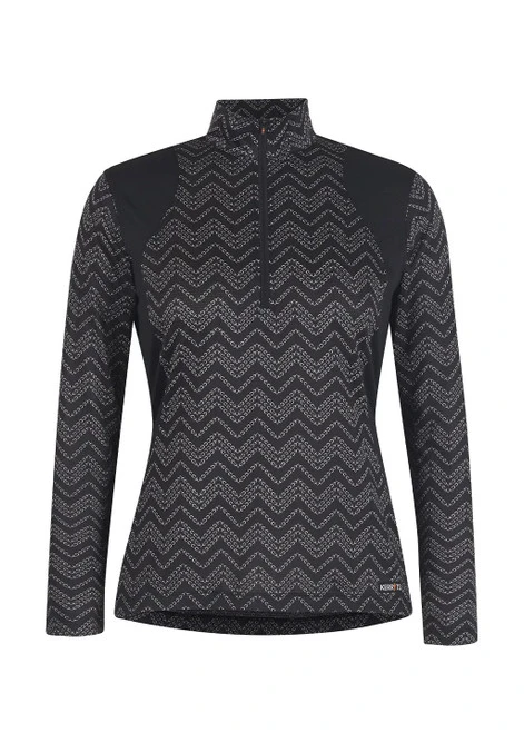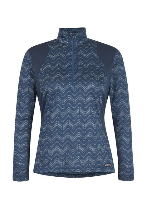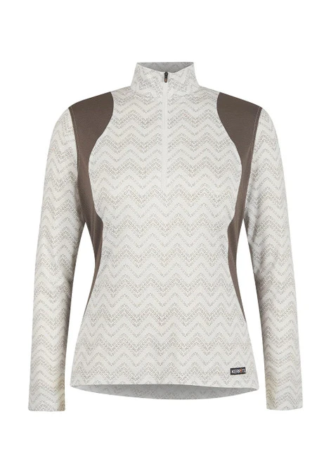 New Easy Stride Ice Fil Long Sleeve Shirt from Kerrits is a women’s riding top in light, breathable fabric made with Ice Fil cooling technology. The Easy Stride Ice Fil Shirts in stylish Kerrits equestrian Hoofprint Chevron pattern and solid colors have a quarter zip mock neck and UPF30+ skin protection.A cling-free relaxed fit plus contrast solid panels on both the print and solid color shirts create a curvy, flattering profile.