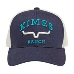 Kimes Ranch Cody Trucker Cap incorporates the iconic Kimes Ranch horns logo with vertical embroidery stripes for a unique flag-style design. The hat has a solid panel front with high quality mesh in back and is available in two colors.