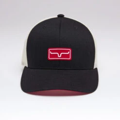 Kimes Ranch Mirror Trucker Hat is a high profile Tall Boy cap with flat bill and cool mesh back. It features a patch with the Kimes horns logo with a light grey/dark grey divided background. The Western casual baseball cap will shade your face and protect your head from the sun in style.