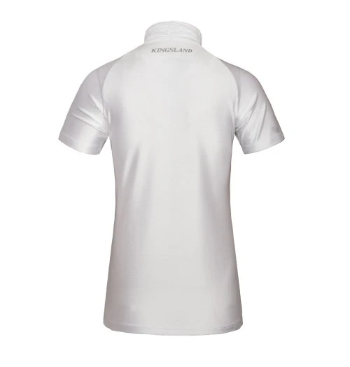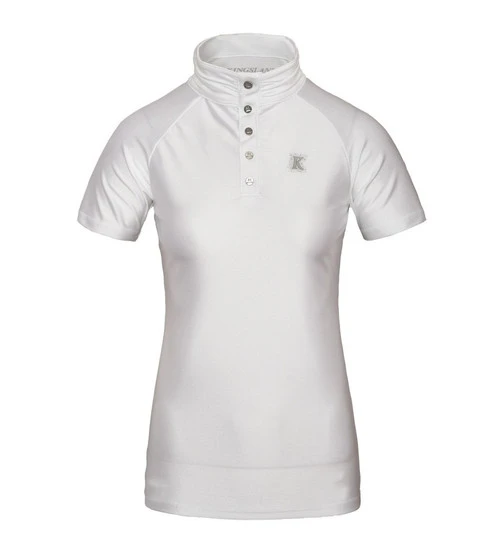 Women’s Bonnie Show Shirt from Kingsland delivers wicking, quick drying performance plus plenty of stretch for total comfort while competing. The lines are flattering and feminine and the all-white color with shimmering silver is eye-catching in the show ring. The Kingsland K embroidery logo at the chest is heavily accented with crystals. Below the collar in back you’ll find a silver Kingsland logo with a scattering of crystals. Enjoy the beauty and comfort of the Kingsland KL Bonnie Show Shirt this summer show season!